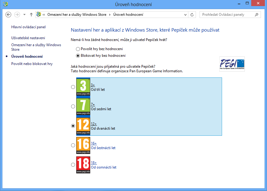 Nicméně díky hodnocení PEGI lze automaticky povolit hraní her pro děti od tří let, od sedmi let, od dvanácti let, od šestnácti let nebo od osmnácti let, aniž by rodiče museli neustále měnit nastavení pro každou nově nainstalovanou hru. Oproti Windows 7 však vypadlo blokování her na základě konkrétního obsahu, který rodiče pro své děti považují za závadový. Násilí, vulgarismy, diskriminaci, sex, nahotu a tak dále.