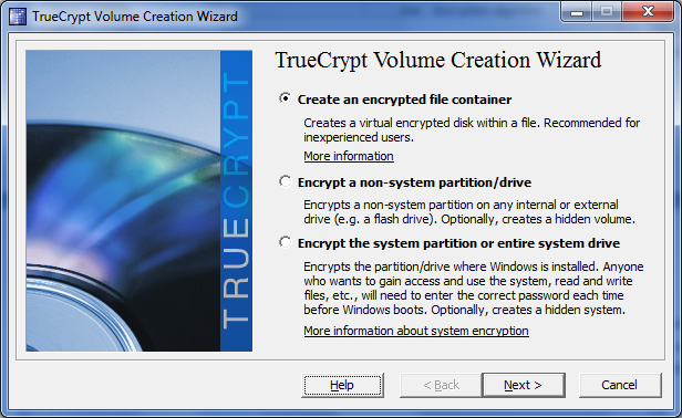 Další možností programu je šifrování celého svazku, což je užitečná funkce pro ochranu kompletního obsahu flash disku nebo přenosného pevného disku. Při jeho ztrátě nebo odcizení je vzhledem k špičkovému šifrování při volbě dostatečně silného hesla vysoce nepravděpodobné, že by se nálezce či zloděj dostal k obsaženým datům.