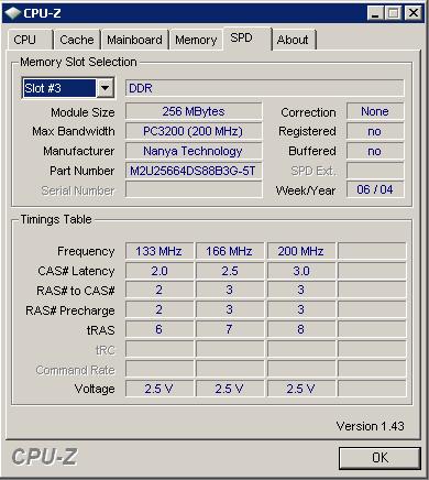 6 )záložka SPD - přečte ze speciálního čipu (jmenuje se SPD[serial presence detect] čip) na vaší operační paměti její přesný typ a údaje o možnostech jejího nastavení..