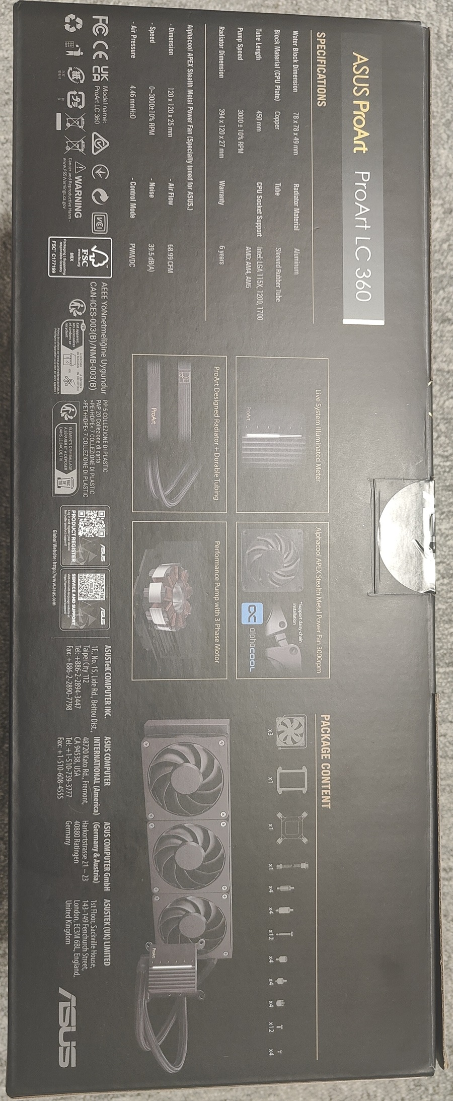 První, čeho si všimnete po vybalení, je precizní zpracování všech komponent. Radiátor je vyroben z vysoce kvalitního hliníku s černou povrchovou úpravou a nese diskrétní ProArt branding. Tloušťka radiátoru činí standardních 27 milimetrů.