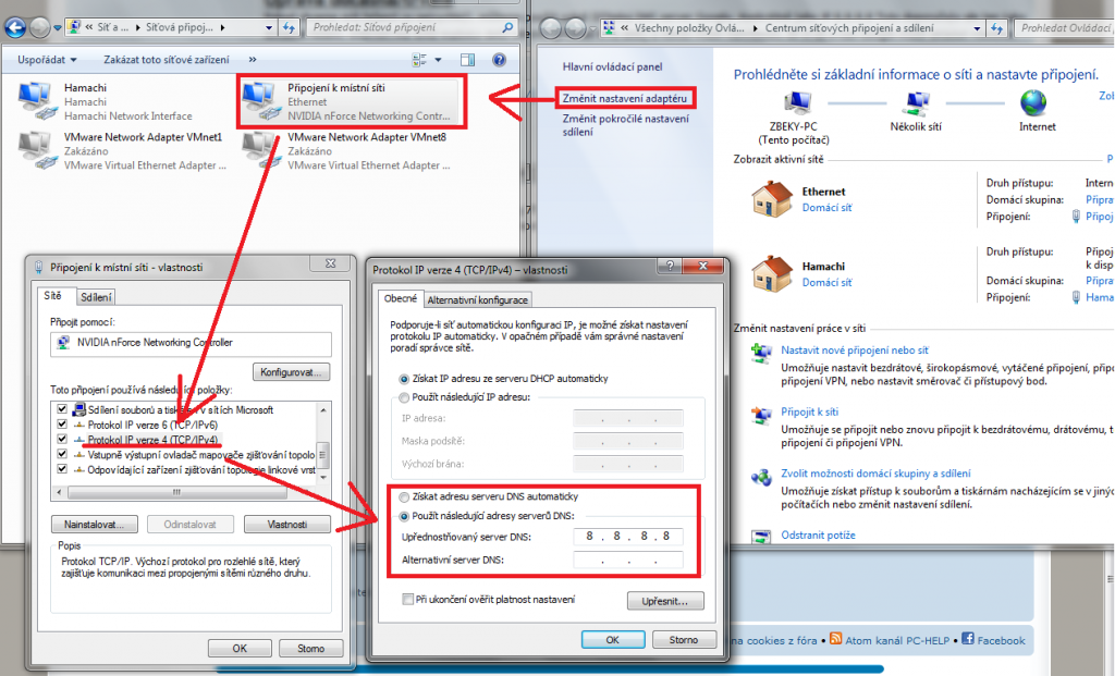 Postup pro Vistu a Sedmičky se v prvních krocích lehce liší. Nejdřív je nutné otevřít Centrum síťových připojení a sdílení (přes ikonku vedle hodin) -> tam kliknout na Zmenit nastavení adaptéru -> vybrat adaptér, u kterého chceme provést změnu (zde Připojení k místní síti) -> kliknout pravým tlačítkem myši a vybrat Vlastnosti -> Dvakrát poklepat na Protokol IP verze 4 (TCP/IPv4). Tam už jen vybereme Použít následující adresy serverů DNS a vyplníme IP (třeba 8.8.8.8 od Googlu). Vše potvrdíme a po tomto by měl již prohlížeč fungovat. Pokud ne, není chyba v DNS.