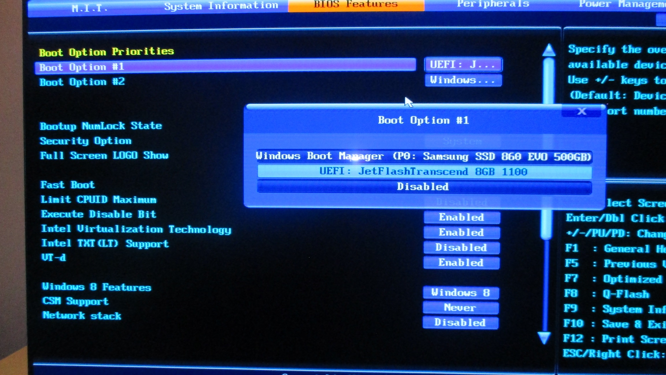Pochopitelně, při restartu PC a následnem pokusu vybrat flashku, aby se bootovalo, tak se nic nedělo a bios mě vracel zpět.