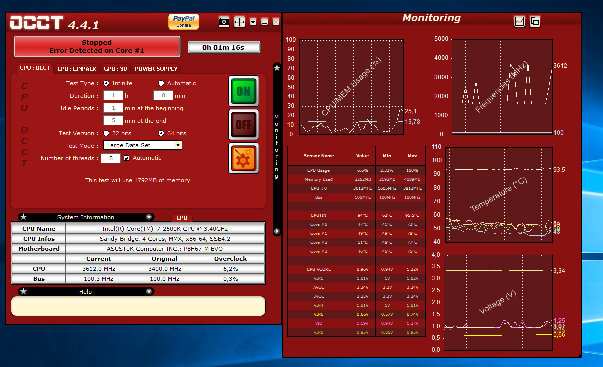 A vypnul jsi tu turbofrekvenci? Zkus to znovu bez ní. Ten error v OCCT nevím co znamená.