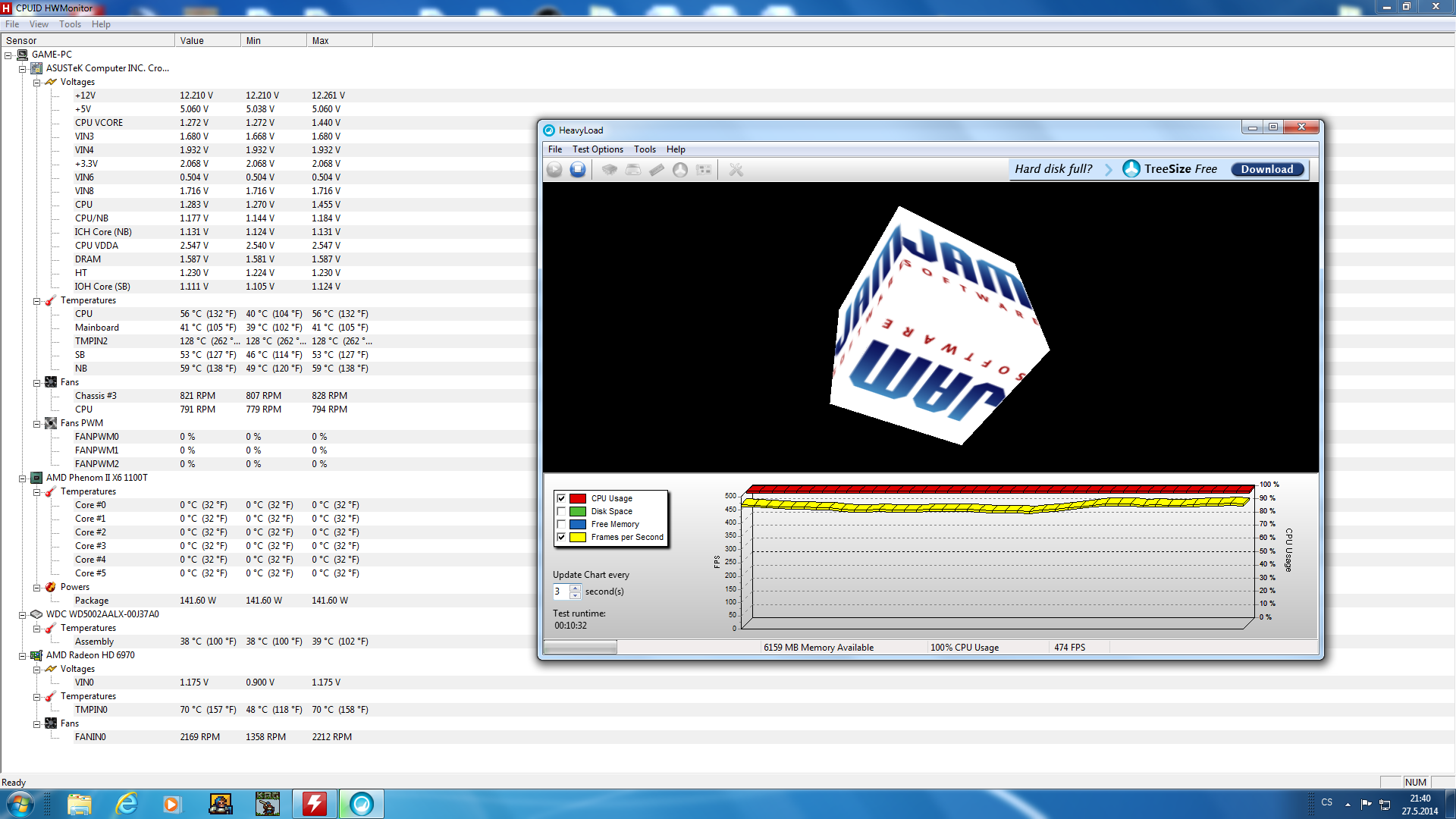 1. Stáhni, nainstaluj a spusť HWMonitor a HeavyLoad. V HeavyLoad spusť zátěžový test, po 10 min udělej screenshot HWMonitoru a dej ho sem jako přílohu.