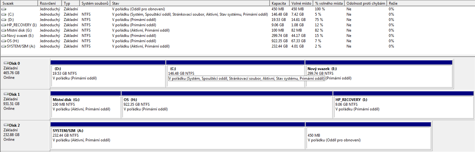 Pic píše:Obávám se, že problém není jednoduchý. Po mrknutím na disky A (to jsem ještě neviděl) je jen 2% volného místa a na disku C (asi Win 7) jen 5%. Již s tím bývají potíže. Možná se najde někdo, kdo to rozlouskne, ale spíše se nevyhneš reinstalaci. A až to dáš znovu do kupy, tak si přečti na co nemáš zapomenout. Nakonec to sám píšeš v popisu problému.