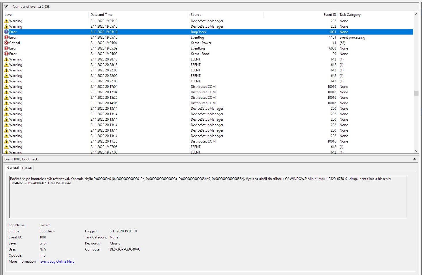 ve složce windows/minidump máš výpis té chyby (soubor dmp) ... chtělo by to otevřít jej v nějakém programu a hodit screen ... aplikace "bluescreenview" nebo "WhoCrashed" ...