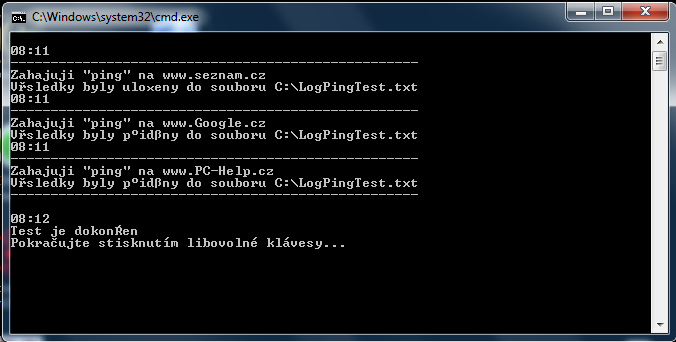 echo Výsledky byly uloženy do souboru C:\LogPingTest.txt