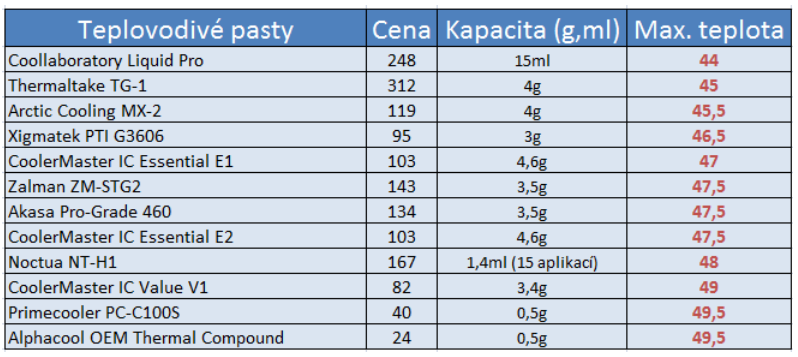Coollaboratory Liquid Pro je co se týče vodivosti super (dosahuje skoro stejných parametrů jako samotné pájení), ale má trochu problém s tím, že ji jaksi nejde odstranit (drží jak svi*a a bává problém od sebe CPU a chladič oddělit, samotná pasta se pak (když už se to povede) musí odstranit lapováním ) a taky docela pěkně rozežírá hliník, takže pod hliníkoný chladič rozhodně ne...