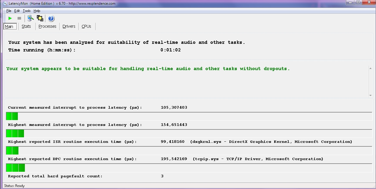 Your system appears to be having trouble handling real-time audio and other tasks. You are likely to experience buffer underruns appearing as drop outs, clicks or pops. One or more DPC routines that belong to a driver running in your system appear to be executing for too long. Also one or more ISR routines that belong to a driver running in your system appear to be executing for too long. One problem may be related to power management, disable CPU throttling settings in Control Panel and BIOS setup. Check for BIOS updatets.